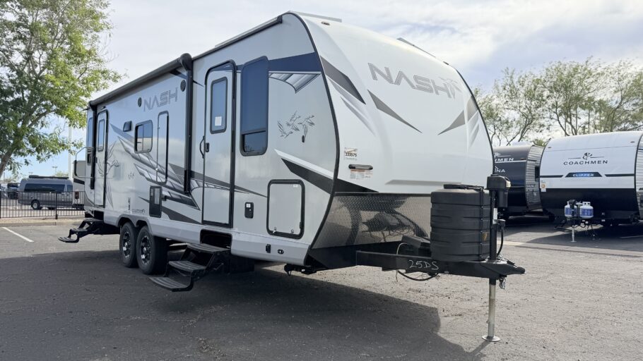 Experience the perfect blend of comfort and adventure with the 2025 Northwood Nash 25DS. This travel trailer is designed to offer a homey retreat while you explore the great outdoors. At just over 29 feet in length, it provides a spacious layout that accommodates up to six sleepers, featuring a cozy queen bed and two convertible sleeping areas. The rear living space is ideal for relaxation, with a jackknife sofa perfectly positioned for enjoying downtime after a day of adventure.