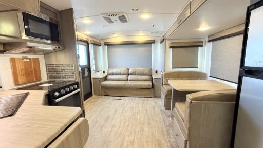 The center kitchen is thoughtfully equipped with a full-size electric refrigerator and a three-burner cooktop, ensuring you have everything needed to whip up your favorite meals. The layout also includes a center bath with a practical plastic/glass shower, offering convenience and privacy. The front bedroom, complete with ample wardrobe space, ensures restful nights under the stars. With its robust off-road knobby tires and a 14.5-foot powered retractable awning, this RV is ready for any terrain and weather, making it your perfect companion for memorable journeys. For more details, visit your nearest General RV dealership.