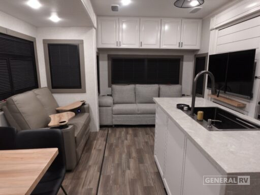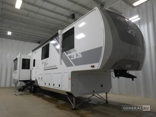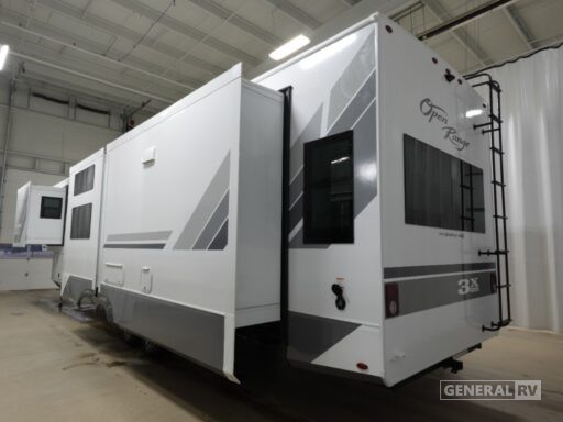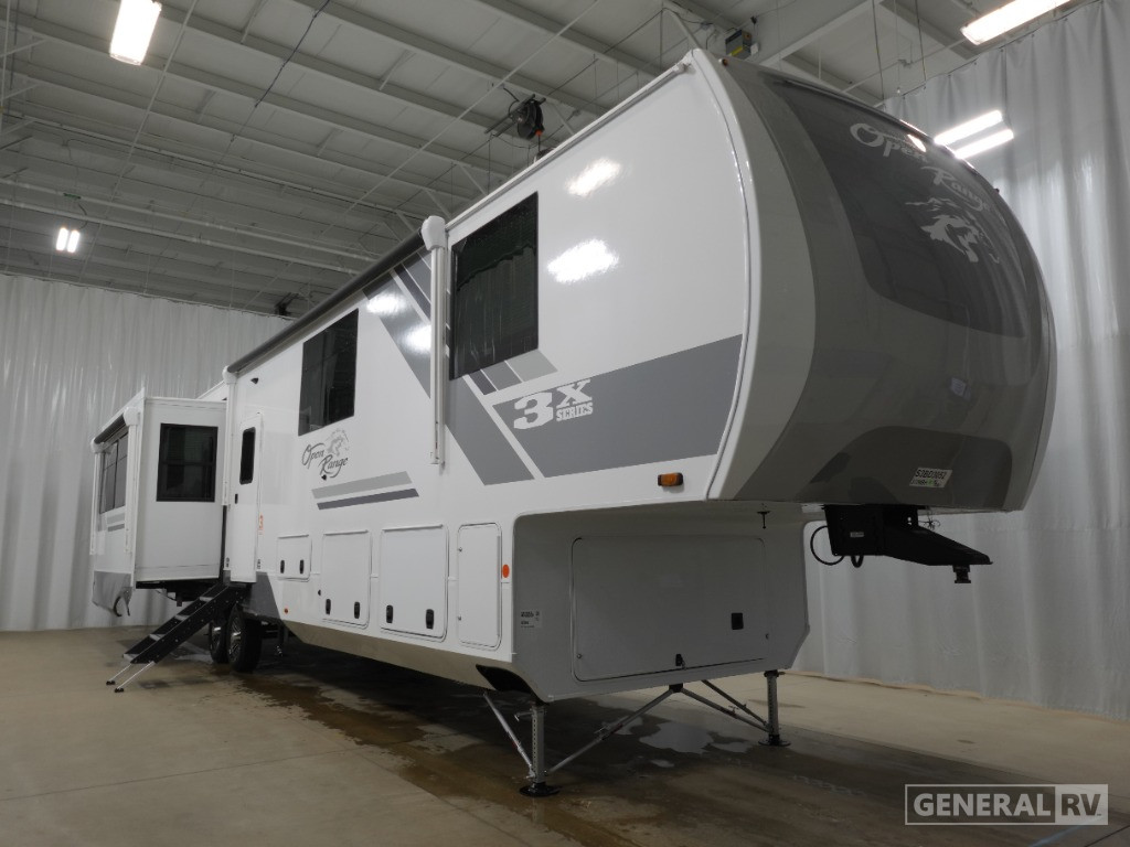 The thoughtful design continues with practical amenities such as a washer/dryer, ensuring convenience on the road. The dual 28-foot powered retractable awnings extend your living space outdoors, perfect for enjoying the fresh air and scenic views. With a robust fresh water capacity of 75 gallons and generous gray and black water tanks, this RV is ready for extended journeys. The Open Range 3X 372MBH combines style, functionality, and innovation, making it the ideal choice for those seeking a home away from home. Discover this remarkable RV at your nearest General RV dealership and embark on your next adventure in style.