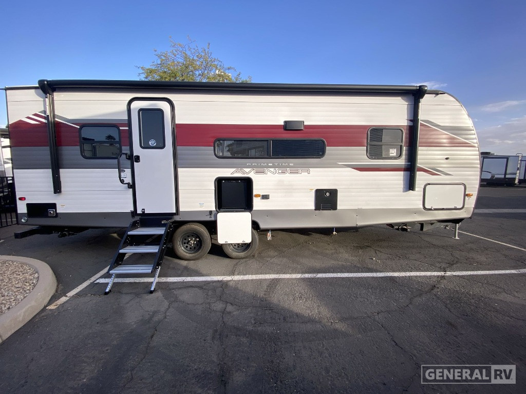 Retreat to the front bedroom, where a comfortable queen bed awaits, flanked by dual wardrobes for your convenience. The rear bath offers privacy and practicality, complete with a shower and plenty of storage space for linens. With a powered retractable awning, you can effortlessly extend your living space outdoors, perfect for enjoying the view or entertaining guests. The Avenger 25MKO’s thoughtful design and modern amenities make it an ideal choice for those who love adventure without compromising on comfort. For more details, visit your nearest General RV dealership.