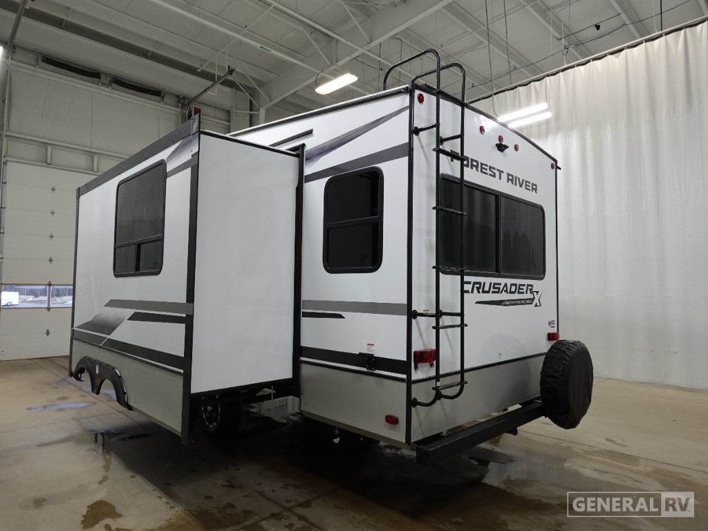 The Crusader X fifth wheels by Prime Time RV are a step above the rest and it's not hard to see why. Each model has been constructed to last with its Eternabond construction, a one-piece PVC roof, and a gel coat fiberglass exterior. The labeled universal docking center will have you set up to camp in no-time, and there is a convenient bottle opener and Doggy D-ring for your furry companions. You will feel right at home with designer countertops, designer carefree linoleum with Scotchgard technology, blackout pleated shades, and many more comforts. The Crusader X also comes standard with a 15,000 BTU A/C, a 35,000 BTU high capacity gas furnace, a tankless on-demand water heater, and the Extreme Thermal Package Plus, making your camping season year-around!