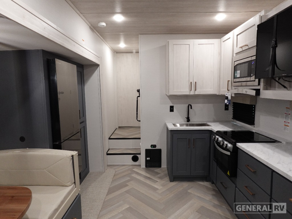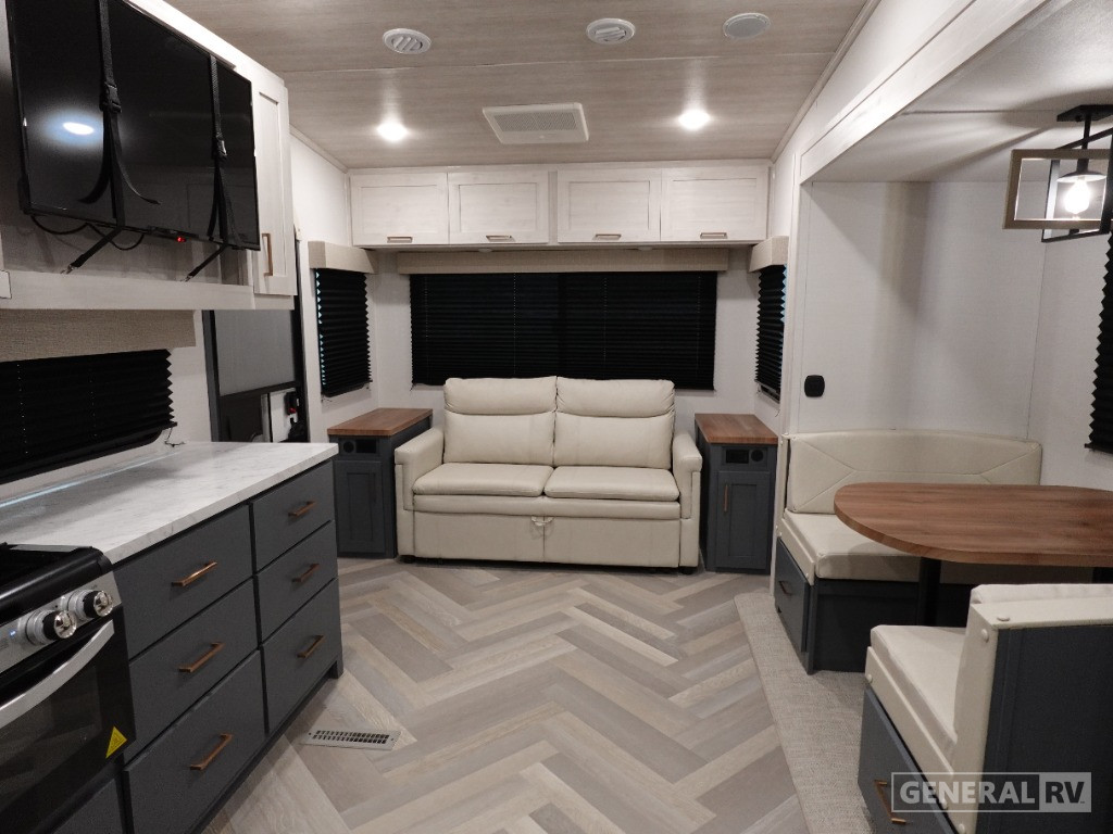 When you're ready to escape the hustle and bustle of city life, hook up this fifth wheel and head out to the woods! Once you set up the awning, you can grab the fishing poles from the pass-through storage and get some fishing in before dinner. The kitchen includes a 10.7 cu. ft. 12V refrigerator, a high-rise faucet, and designer countertops you are sure to love. You can dine at the booth dinette within the slide out, or relax on the sofa, both of which are in good view of the 40" LED Smart TV! The front private bedroom in this model will feel just like home with its walk-around queen bed, wardrobe, and dual nightstands!