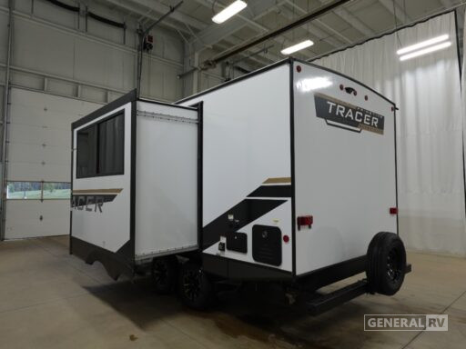 At the heart of the Tracer 190RB is a serene sleeping area complete with a plush queen bed and ample wardrobe storage, ensuring a restful night's sleep after a day of adventure. The rear bathroom offers privacy and practicality with a shower curtain and linen storage. Enjoy the great outdoors under the 12.5-foot powered retractable awning, ideal for relaxing or entertaining. With its lightweight design and impressive cargo capacity, this travel trailer is ready to accompany you on all your journeys. For more information or to see this model in person, visit your nearest General RV dealership.
