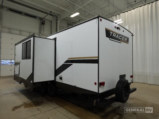 The Tracer 250BH ensures relaxation and entertainment with its inviting theater seating and entertainment center, creating a cozy retreat after a day of exploration. The rear bath, complete with a shower curtain, offers privacy and convenience. With a powered retractable awning, you can effortlessly extend your living space outdoors, creating the perfect spot for morning coffees or evening gatherings.
