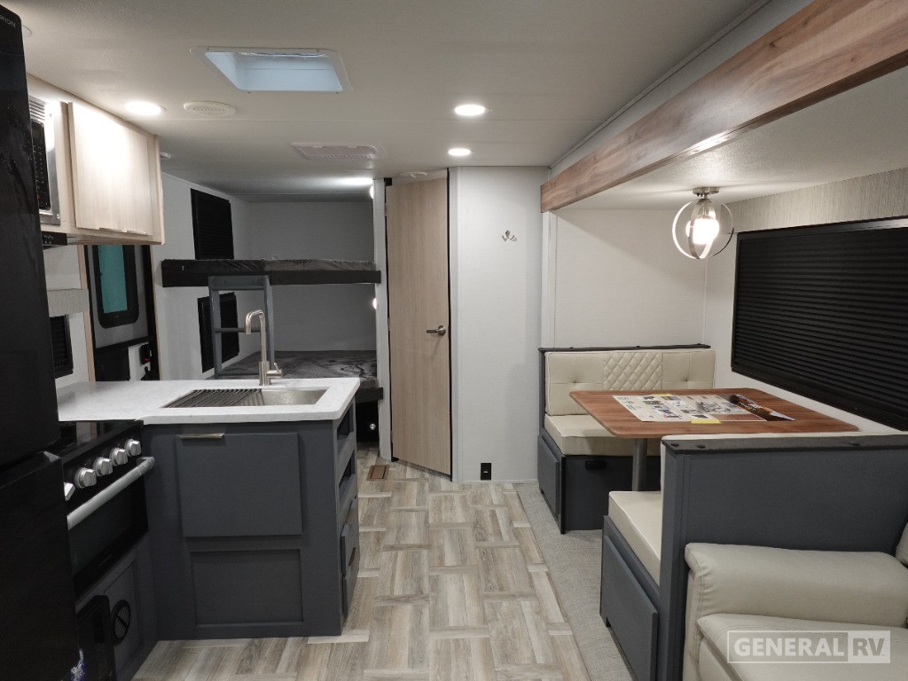 If you're looking for more comfort and a larger sleeping capacity in your next RV, this travel trailer is the one! There are double-size bunks in the rear corner, along with a ladder to easily hop into bed, and the full bath is in the other rear corner for easy nighttime use. You'll enjoy the front private bedroom with its queen bed and dual wardrobes for your things, and a separate closet with washer and dryer prep if you choose to add those appliances. And one of the dual entry doors is located here so you can easily slip out in the morning without waking everyone else up in the trailer! In the morning, you can make breakfast in the full kitchen, then dine at the booth dinette within the large slide out. There is also a theater here for more comfort. This travel trailer also includes plenty of storage space, including a walk-in pantry with shelves, an additional storage closet, and a pass-thru storage outside for fishing poles!