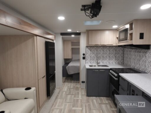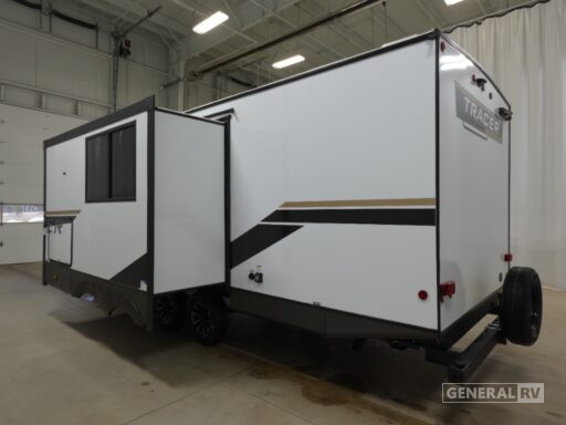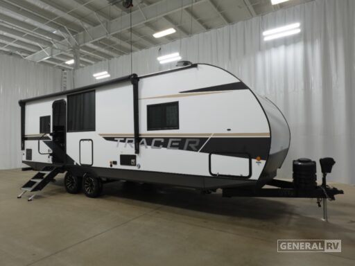In the front, the inviting queen bed promises restful nights, surrounded by ample storage options to keep your belongings organized. The rear of the trailer features a well-appointed bathroom with a shower and a washer/dryer prep area, ensuring you have everything you need for extended trips. The powered retractable awning extends your living space to the outdoors, perfect for enjoying the fresh air and scenic views. Built with quality and comfort in mind, the Tracer 255DS is your ticket to unforgettable journeys. For more details, visit your nearest General RV dealership.