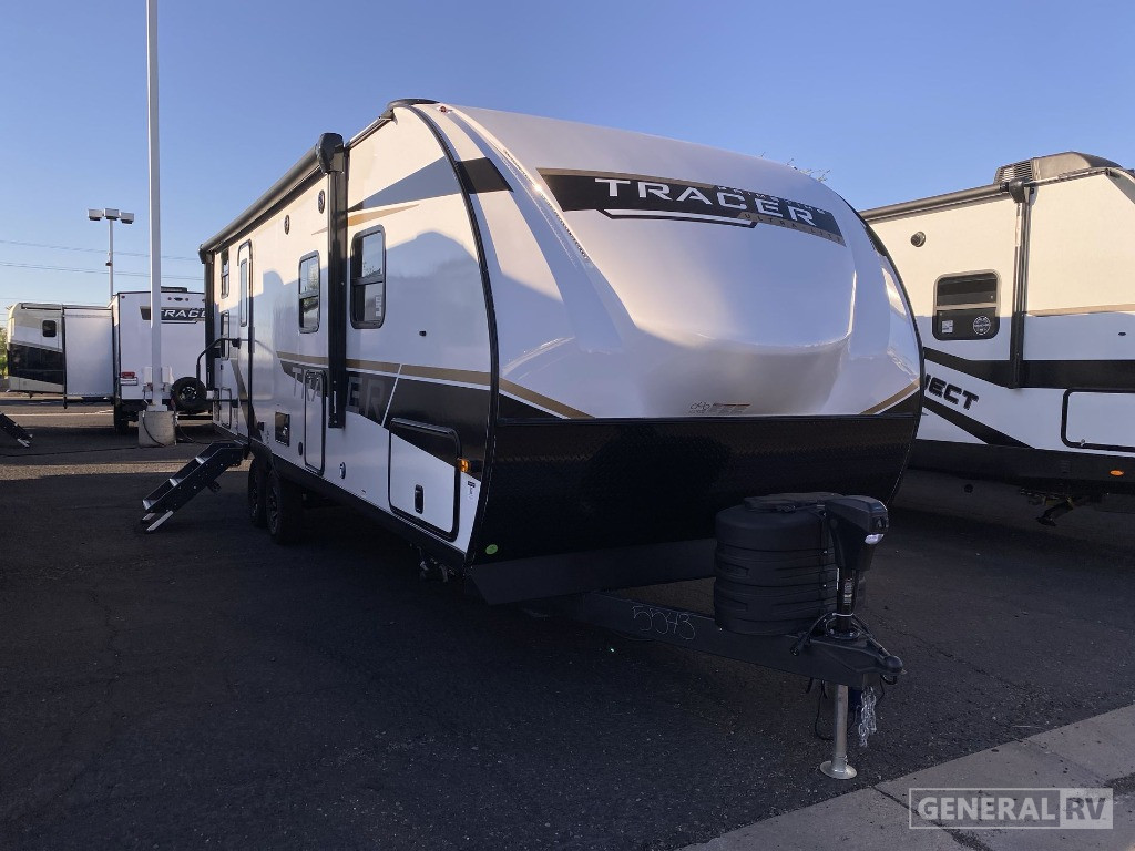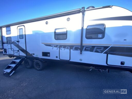 With a length of just under 30 feet and a dry weight of 5,598 pounds, this RV is easy to tow yet spacious enough for all your needs. Its ample storage options, including pass-thru storage and a bike door, ensure you can bring along all your adventure gear. Whether you're exploring the great outdoors or relaxing at the campsite, the Tracer 25BHS is your ideal home on wheels. For more details or to see it in person, visit your nearest General RV Dealership.
