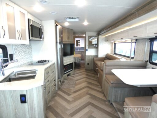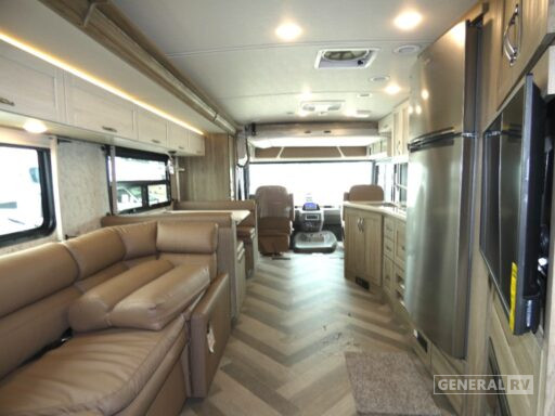 Retreat to the center bedroom, where a plush king bed awaits, promising restful nights after a day of exploration. The bathroom, conveniently located at the rear, features a stylish shower with plastic and glass elements. With ample storage, including a wardrobe and storage cabinets, you’ll have plenty of room for all your travel essentials. This motorhome is prepped for a washer/dryer, adding an extra layer of convenience for extended journeys. Built on a robust Ford F53 chassis and powered by a 335-horsepower engine, the Adventurer 35F ensures a smooth and powerful ride. For more details and to experience this RV in person, visit your nearest General RV Dealership.