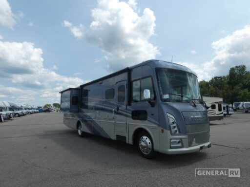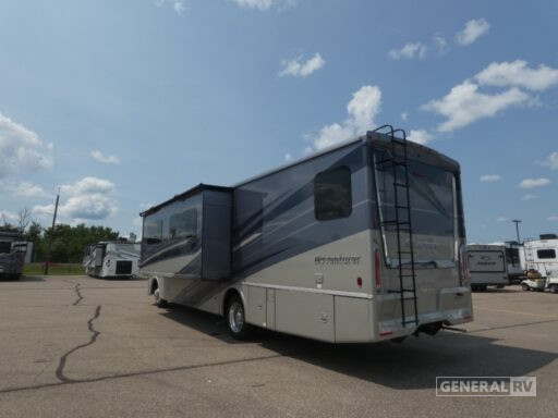 Retreat to the center bedroom, where a plush king bed awaits, promising restful nights after a day of exploration. The bathroom, conveniently located at the rear, features a stylish shower with plastic and glass elements. With ample storage, including a wardrobe and storage cabinets, you’ll have plenty of room for all your travel essentials. This motorhome is prepped for a washer/dryer, adding an extra layer of convenience for extended journeys. Built on a robust Ford F53 chassis and powered by a 335-horsepower engine, the Adventurer 35F ensures a smooth and powerful ride. For more details and to experience this RV in person, visit your nearest General RV Dealership.