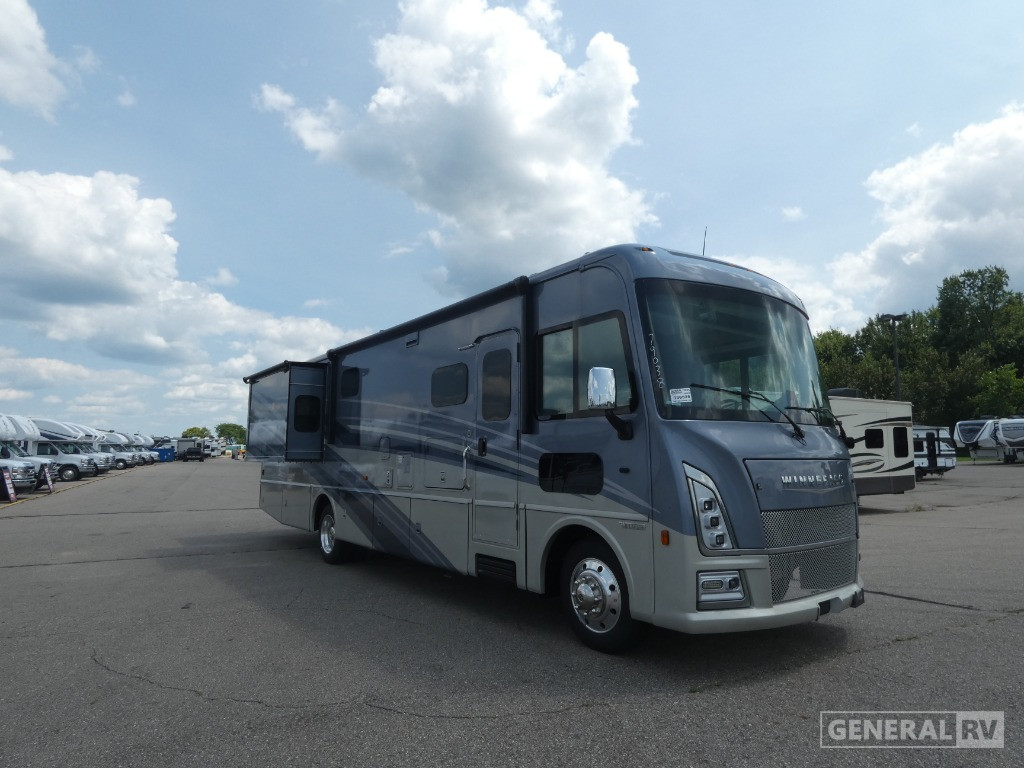 The 2025 Winnebago Adventurer 35F is your ticket to luxurious road adventures, blending comfort and functionality in a sleek package. As you explore its spacious interior, you'll find a thoughtfully designed layout featuring a front kitchen and a center living area, perfect for entertaining or relaxing with family and friends. The extendable sectional sofa and dinette provide versatile seating options, while the residential refrigerator and convection cooking make meal preparation a breeze. The powered retractable awning invites you to enjoy the outdoors, offering shade and comfort wherever you park.