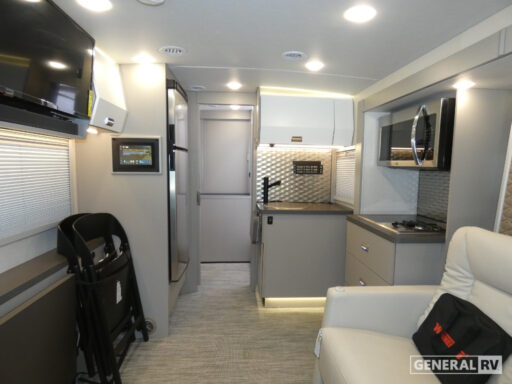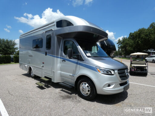 As you explore further, the rear bath provides a private retreat with a convenient sliding door, and the exterior storage ensures you have plenty of room for all your travel essentials. The powered retractable awning expands your living space to the outdoors, perfect for enjoying sunny days or starlit nights. With a fuel-efficient diesel engine and a tow capacity of 5,000 pounds, the Navion 24T is ready to take you wherever your heart desires. Visit your nearest General RV dealership to discover more about this remarkable home on wheels.