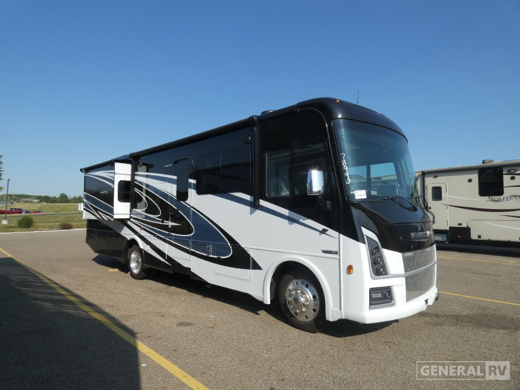 This Class A Vista from Winnebago has tons of great features. You'll love the private bedroom that includes a king bed, dual wardrobes, and a full rear bath with a 36" x 36" shower. An additional half bath is convenient for guests or when you have a big group travelling together. There are plenty of places to sleep, with a standard sofa bed and an optional StudioLoft drop-down bed that is designed to accommodate two additional guests with a generous 600-lb. capacity. The well-equipped kitchen has a three-burner cooktop, stainless steel double sink, 10 cu. ft. refrigerator, and two pantries. An additional coat closet by the door plus exterior lighted storage compartments means there's plenty of room for all your gear.