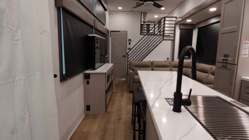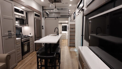 This destination trailer is perfect for a big crowd since it has one Power Tilting king bed, three mattress and an L- shape sofa. Experience the in-home feeling with the amazing kitchen and living room, furnished with a Kitchen island, L- shape sofa and a residential 110 V fridge. Also, you can sense the extreme coziness thanks to the dual fire places and get 24/7 entertainment due to the four TVs along the trailer. Plenty of place can be found in the front and rear loft bedrooms with three wardrobes in total. Lastly the two full bathrooms will allow you to comfortably take a shower after a long day.