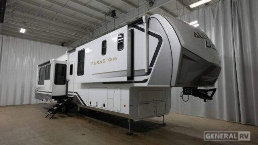 The Paradigm fifth wheels by Alliance RV are functional, high-quality, and luxurious for an unforgettable camping experience. There are three A/C units and a 40K BTU furnace to keep you comfortable year around, and you'll appreciate additional convenient amenities, like the all-in-one enclosed/heated utility center and the color coded and numbered wiring. A Helux Series coil spring pin box comes standard for hassle-free towing, along with Curt 8,000 lb. axles. You'll love the kitchen with its LG solid surface countertops and Lusso range, plus there is LED motion lighting in the pantry and a Maxx fan with a rain sensor to keep everything fresh when making dinner. Each model also includes an HD Smart TV in the living room and bedroom. And of course there are a variety of options you can choose from to further customize your fifth wheel; dual pane windows, Super Solar Plus, slide out awning toppers, and generator prep or a generator to name a few!
