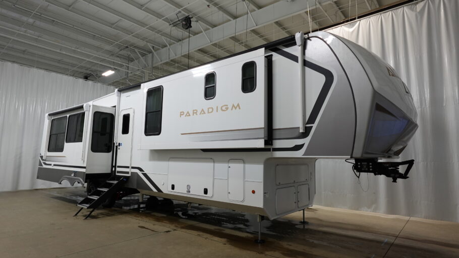 The Paradigm fifth wheels by Alliance RV are functional, high-quality, and luxurious for an unforgettable camping experience. There are three A/C units and a 40K BTU furnace to keep you comfortable year around, and you'll appreciate additional convenient amenities, like the all-in-one enclosed/heated utility center and the color coded and numbered wiring. A Helux Series coil spring pin box comes standard for hassle-free towing, along with Curt 8,000 lb. axles. You'll love the kitchen with its LG solid surface countertops and Lusso range, plus there is LED motion lighting in the pantry and a Maxx fan with a rain sensor to keep everything fresh when making dinner. Each model also includes an HD Smart TV in the living room and bedroom. And of course there are a variety of options you can choose from to further customize your fifth wheel; dual pane windows, Super Solar Plus, slide out awning toppers, and generator prep or a generator to name a few!