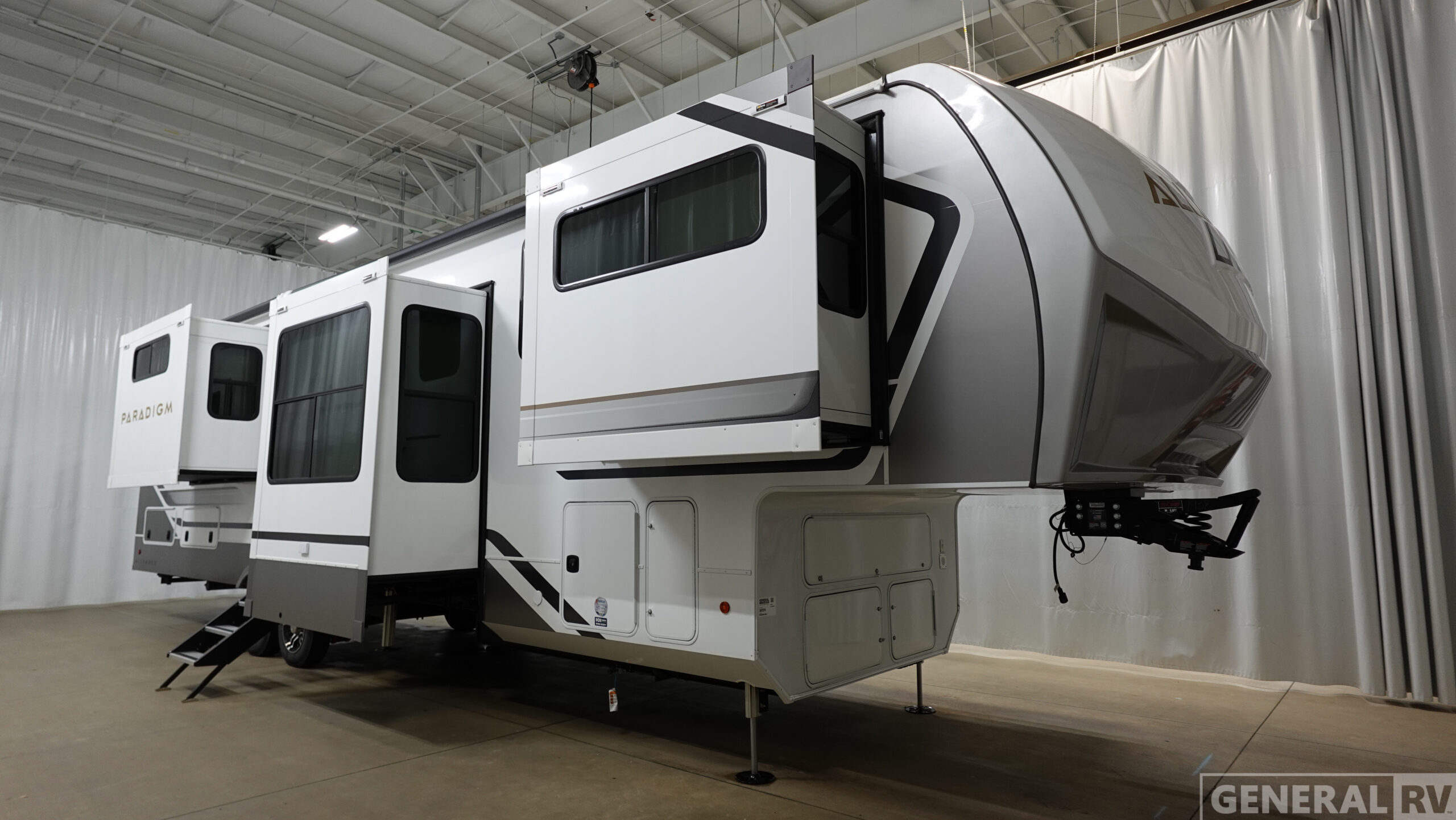 Step into the center bedroom, where a king bed promises restful nights, and enjoy the convenience of washer/dryer prep for extended journeys. The rear bath, complete with a shower and ample storage, ensures a refreshing start to your day. With a generous 98-gallon fresh water capacity and powered retractable awnings, your outdoor experience is just as delightful. The Paradigm 385FL is more than just an RV; it's your ticket to exploring the open road in style and comfort. For more details or to see this model in person, visit your nearest General RV Dealership.