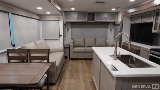 With any Avenue fifth wheel or travel trailer by Alliance RV, you will enjoy more interior space provided by the 8' 5" wide-body construction, and a long list of luxury features. Each is built with Azdel composite sidewalls both inside and out, along with a PVC roof for added strength. There are innovative storage solutions that include hidden storage behind the TV, within end tables and ottomans, and more. Since these units feature no carpet throughout, cleaning will be easier than ever, and there are flush floor slides throughout for seamless living spaces. The Avenue also comes with the OTG Solar Package with a 400 watt solar panel, inverter prep, multiple outlets, and more to keep you charged up!
