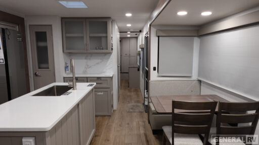 A kitchen island with countertop space makes it easy to prepare meals in this travel trailer! The floating dinette table has two chairs on one side and a movable ottoman with flip up storage on the other side to keep your games or extra table cloths in. You can store your dishes and snacks inside the hutch/pantry or in the second pantry. There is also a dresser and large wardrobe with shelving. The rear living area features a dual recliner theater seat across from an entertainment center with a 50" class HDTV with hidden storage behind it, and is also on a swing mount for all to see even at the rear sleeper sofa!