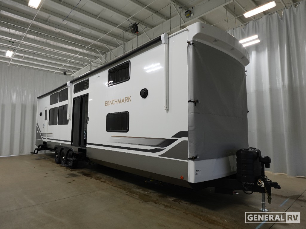With any Benchmark destination trailer by Alliance RV, you will enjoy luxury features at every turn! The high gloss fiberglass exterior is ultra sleek, and the Azdel composite fiberglass sidewalls add durability so you can camp for years to come. You'll also find a residential exterior garden hose connection outside, along with a powder coated aluminum rear ladder, and an auxiliary LP tank hook up if you want to bring your grill along. Head inside to find hardwood cabinetry, solid surface countertops throughout, oversized windows in all rooms, and MCD roller shades throughout. The 45,000 BTU A/C and 60,000 BTU furnace will keep you comfortable year around, and there is a stackable washer and dryer to make full-time RV living easier than ever!