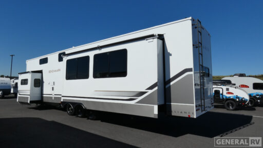 With any Benchmark destination trailer by Alliance RV, you will enjoy luxury features at every turn! The high gloss fiberglass exterior is ultra sleek, and the Azdel composite fiberglass sidewalls add durability so you can camp for years to come. You'll also find a residential exterior garden hose connection outside, along with a powder coated aluminum rear ladder, and an auxiliary LP tank hook up if you want to bring your grill along. Head inside to find hardwood cabinetry, solid surface countertops throughout, oversized windows in all rooms, and MCD roller shades throughout. The 45,000 BTU A/C and 60,000 BTU furnace will keep you comfortable year around, and there is a stackable washer and dryer to make full-time RV living easier than ever!