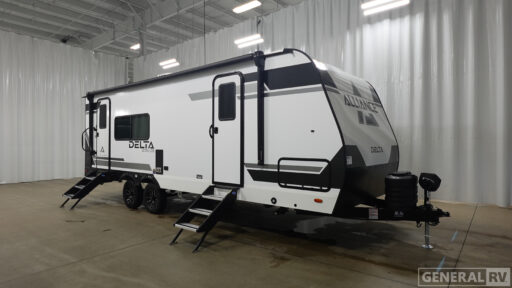 The front bedroom offers a tranquil retreat with a comfortable queen-sized bed, surrounded by ample wardrobe storage to keep your essentials organized. The center bath is efficiently designed with a 30"x36" shower, ensuring you have all the conveniences you need on the road. Outside, enjoy the large 19-foot powered retractable awning, perfect for extending your living space into the great outdoors. With its robust construction, including Goodyear Endurance tires and a substantial cargo capacity, the Delta RK234 is ready to take you on countless adventures. For more details, visit your nearest General RV dealership today!