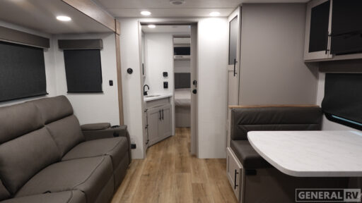 You'll love camping in this rear kitchen travel trailer with generous counter space and overhead storage for spices, dishes, and more. You can dine each day at the booth dinette or relax on the sofa slide out, which will provide more floor space. The spacious walk-thru bath includes a 30" x 36" shower, toilet, and vanity so you can clean up each day. Head to the front master bedroom where you can sleep soundly on the walk-around queen bed with dual nightstands and wardrobes. The second entry door is also found in this room so you can slip out for an early morning run!