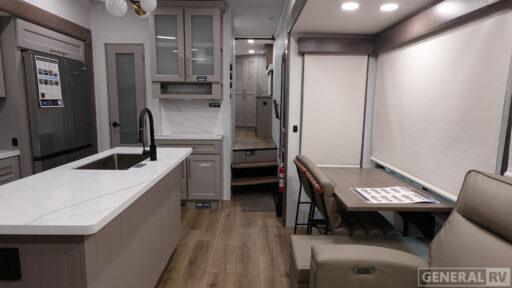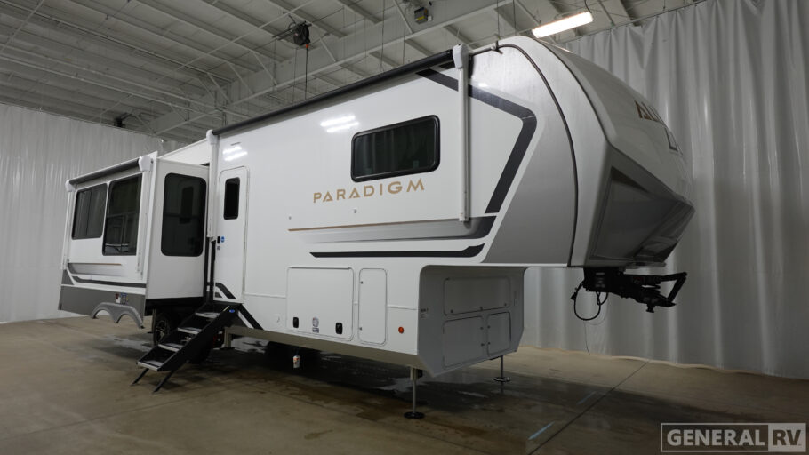The front bedroom offers a serene retreat with the option of a king or queen bed, complemented by ample storage and washer/dryer prep for added convenience. The center bath features a stylish 48"x30" shower, providing a refreshing escape after a day of adventure. With a generous fresh water capacity of 98 gallons and dual powered retractable awnings, the Paradigm 310RL is perfectly equipped for extended stays and outdoor enjoyment. Visit your nearest General RV dealership to explore this exceptional model and start your journey in style.