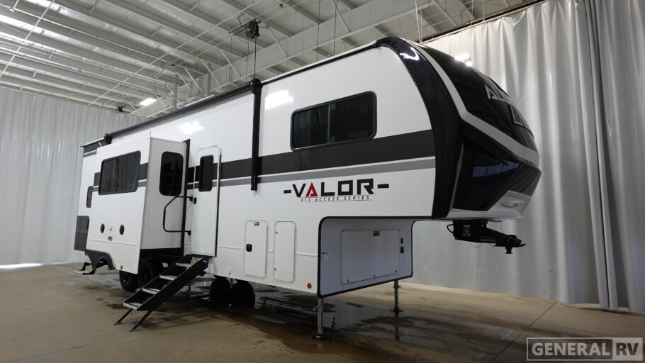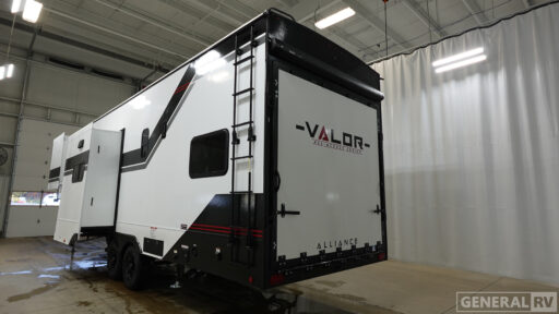 The Valor 32A10 is equipped with a 12 cu. ft. refrigerator and a well-appointed kitchen, making meal preparation a breeze. The large 30"x48" shower and ample tank capacities ensure you stay refreshed on the road. With a 30-gallon fuel tank for your toys and a weather-resistant ramp door, this RV is ready for any escapade. Whether you're seeking a weekend getaway or an extended journey, the Alliance Valor 32A10 is your gateway to exploring the open road in style. For more details, visit your nearest General RV dealership.