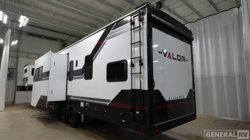 The Valor 40V13 boasts a thoughtfully designed living space with three slides, enhancing the open feel and providing plenty of room for relaxation. Enjoy the warmth of the fireplace as you unwind in the center living area, or step outside under one of the two powered retractable awnings for a breath of fresh air. With a robust fresh water capacity of 98 gallons and equally impressive gray and black water capacities, this RV is perfect for extended adventures. Don't miss out on the chance to own this remarkable fifth wheel. For more information, visit your nearest General RV dealership location.