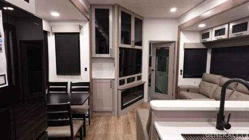 The whole gang will love camping in this toy hauler with a 14' garage for your toys and gear. Once you have arrived at your destination, you can set up the HappiJac roll-over sofas with a queen bed above them, and also a loft which opens to the garage area as well. A half bath is also available off the garage which is an added convenience for those sleeping in this converted area, and for those coming in off the trail so that they do not have to track all through the main unit to use the bathroom. The chef can prepare great meals for their hungry crew with the fully equipped kitchen including a four burner cooktop, a stainless steel 12V refrigerator, large sink, and plenty of countertop prep space. The rest of the gang can be relaxing on the large L-shaped sofa slide watching the 50" HDTV and enjoying the fireplace, or playing a game of cards at the dining table with four chairs. The front private bedroom features a king bed slide for more interior space, a flip top dresser for all of your belongings, and a front wardrobe with washer and dryer prep, plus it has an entrance into the dual entry bathroom!