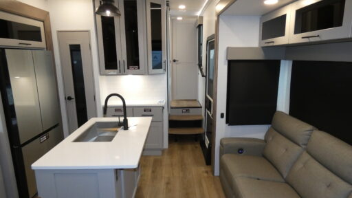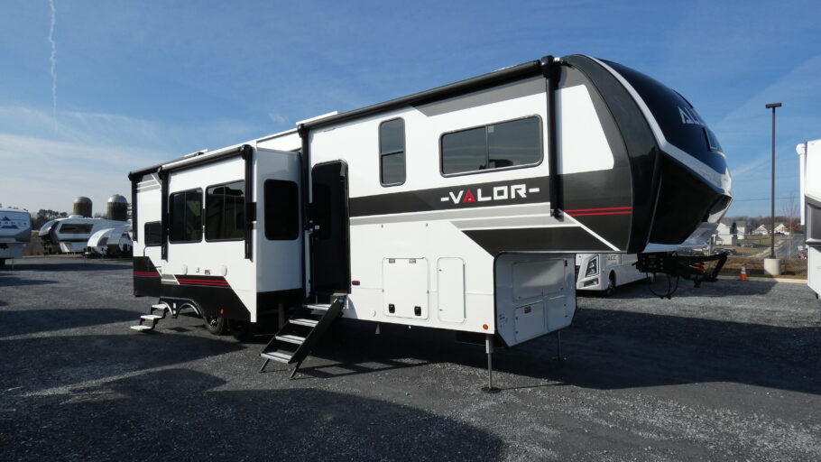 You can bring your toys with you wherever you go with any one of these Alliance RV Valor toy hauler fifth wheels! They are adventure-ready with a quality build from the walk on roof with seamless PVC roof covering to the commercial grade vinyl flooring and MorRyde CRE3000 suspension system. The Performance Running Gear package comes with a 101" wide-body benchmark chassis platform, 7,000 lb. Dexter axles, and a space enhancing drop frame storage compartment to pack in all your riding gear. You can even go off-gridding thanks to the Off the Grid Pack that has two 400 watt solar panels, generator prep, a 40 amp charge controller, and a 100 amp hour lithium iron phosphate battery. Some of the interior comforts you will enjoy are the hardwood cabinet doors and drawers, solid surface kitchen countertops, and commercial grade vinyl flooring with no carpet to make clean up a breeze. The Valor toy haulers are also the Masters of 12 Volt with USB charging station throughout, a stainless steel refrigerator, and more 12 volt features to make camping hassle-free!