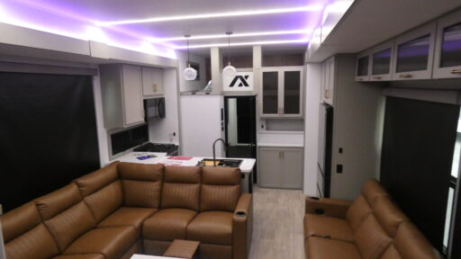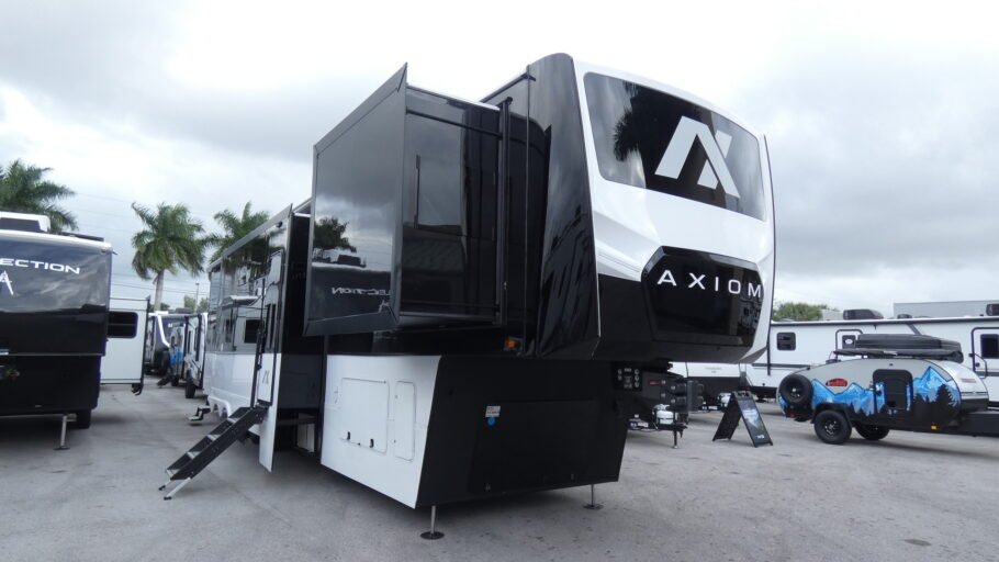 With any Vendetta toy hauler fifth wheel by Axiom RV, you will find innovation and comfort at every turn! The Curt Touring Coil Suspension System with a Curt pin box will provide smooth towing from home to campground, and the deluxe graphics with marine grade fiberglass exterior is sure to be eye-catching. These features are found within the Lux Package, along with a Pathfinder lighting system with integrated turn signals, Lippert solid step triple entry steps, and a low alloy steel construction that is stronger than the competition! The Essential Package features a Lippert 6-point hydraulic leveling system to have you set up at camp in no-time, and the 200-watt solar panel with a 2000-watt inverter provides off-grid capabilities. Solid surface kitchen countertops are included with the AX Comfort Package, along with a Fogotti on-demand water heater, a freedom pass-through storage, Starlink internet prep, and hardwood cabinet doors with slow close hidden hinges.