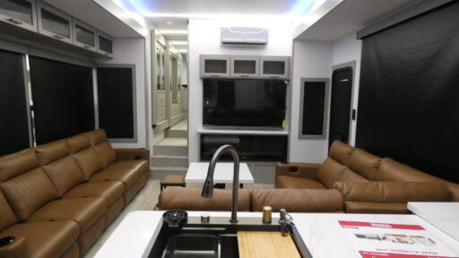 Load up your motorcycles or side-by-side for fun adventures at the campground! There is a 14' 6" garage with one of the dual entry doors to the unit, along with a 60" x 100" mega bed, half bath, fold-down garage sink, plus a loft for even more sleeping space. As you head into the kitchen and living room, you'll find an island peninsula for ample counter space, a large sofa within the slide out, plus an L-shaped sofa with a patent-pending AX ottoman/table. The full bath is right next to the front private bedroom, complete with a king bed tilt and large slide out with generous storage space!