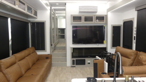 With any Vendetta toy hauler fifth wheel by Axiom RV, you will find innovation and comfort at every turn! The Curt Touring Coil Suspension System with a Curt pin box will provide smooth towing from home to campground, and the deluxe graphics with marine grade fiberglass exterior is sure to be eye-catching. These features are found within the Lux Package, along with a Pathfinder lighting system with integrated turn signals, Lippert solid step triple entry steps, and a low alloy steel construction that is stronger than the competition! The Essential Package features a Lippert 6-point hydraulic leveling system to have you set up at camp in no-time, and the 200-watt solar panel with a 2000-watt inverter provides off-grid capabilities. Solid surface kitchen countertops are included with the AX Comfort Package, along with a Fogotti on-demand water heater, a freedom pass-through storage, Starlink internet prep, and hardwood cabinet doors with slow close hidden hinges.