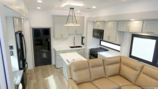 With any Model G toy hauler fifth wheel by Brinkley you will enjoy luxurious amenities, tons of storage space, and innovative features that have been developed and tested in the real world. Durable construction includes an industry leading PDI process, an industry best insulation package, and reinforced and walkable slide roofs. Some of the exterior features you'll find are a 3-way pass-through with a multi-functional flip-up bulkhead wall, under I-beam storage, a MAX-Vision reverse lighting system, and a low-maintenance roof to name a few. A Rockford Fosgate audio system comes standard, along with a OneControl app system that lets you control your fifth wheel's functions right from your mobile device. You will find the solar system with a designated storage area to be ultra convenient, plus there is a FlexPower 5500 with a dual fuel inverter generator for all your power needs. Head inside to find a residential interior with Brinkley's CraftSense wood trim construction, floating entrance steps, integrated window screens and insulated blackout blinds, and residential solid surface countertops plus backsplash. You will also enjoy the neon shower lighting and recessed medicine cabinets in the bath, plus motion activated LED bed lights and dual bedside outlets in the bedroom. Choose a Model G toy hauler fifth wheel to experience all the luxury it has to offer!