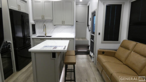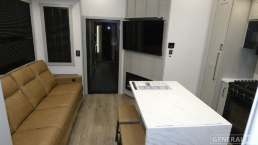 Step into the future of RV living with the 2026 Brinkley Model G 4000. This luxurious fifth wheel is designed for those who crave both adventure and comfort. With an impressive length of over 45 feet, it offers ample space for family and friends, comfortably sleeping up to seven. The dual bedroom setup, featuring a king bed, along with a convertible option, ensures restful nights after days of exploration. The clever floorplan places the kitchen, living, and bath areas centrally, providing a seamless flow throughout the interior.