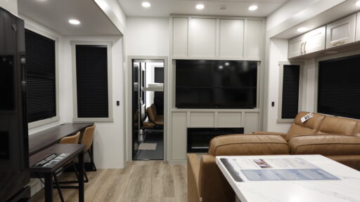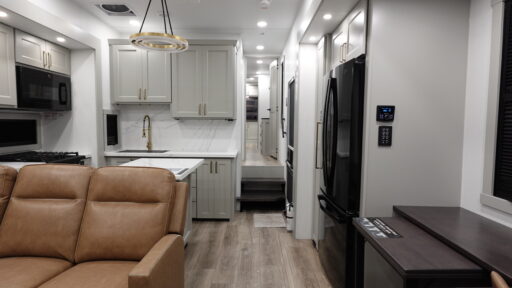 With any Model G toy hauler fifth wheel by Brinkley you will enjoy luxurious amenities, tons of storage space, and innovative features that have been developed and tested in the real world. Durable construction includes an industry leading PDI process, an industry best insulation package, and reinforced and walkable slide roofs. Some of the exterior features you'll find are a 3-way pass-through with a multi-functional flip-up bulkhead wall, under I-beam storage, a MAX-Vision reverse lighting system, and a low-maintenance roof to name a few. A Rockford Fosgate audio system comes standard, along with a Full app-based coach control system (iOS & Android) that lets you control your fifth wheel's functions right from your mobile device. You will find the solar system with a designated storage area to be ultra convenient, plus there is a FlexPower 5500 with a dual fuel inverter generator for all your power needs. Head inside to find a residential interior with Brinkley's CraftSense wood trim construction, floating entrance steps, integrated window screens and insulated blackout blinds, and residential solid surface countertops plus backsplash. You will also enjoy the neon shower lighting and recessed medicine cabinets in the bath, plus motion activated LED bed lights and dual bedside outlets in the bedroom. Choose a Model G toy hauler fifth wheel to experience all the luxury it has to offer!