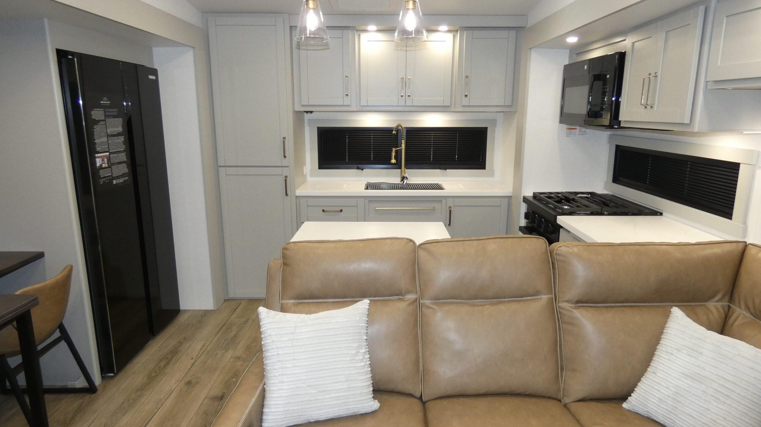 The Brinkley mid-profile Model Z fifth wheels bring you clean lines and an upscale look with plenty of style and exciting new features like the industry first brass plumbing connections. These units also feature an automotive grade front cap, plenty of exterior storage, exterior hot and cold showers, and wide stance leveling jacks for easy set up. Residential frameless windows provide a clean look and beautiful views, and ample electrical outlets and 6 USB/USB-C outlets allow all of your electronics and appliances to easily be used and charged.