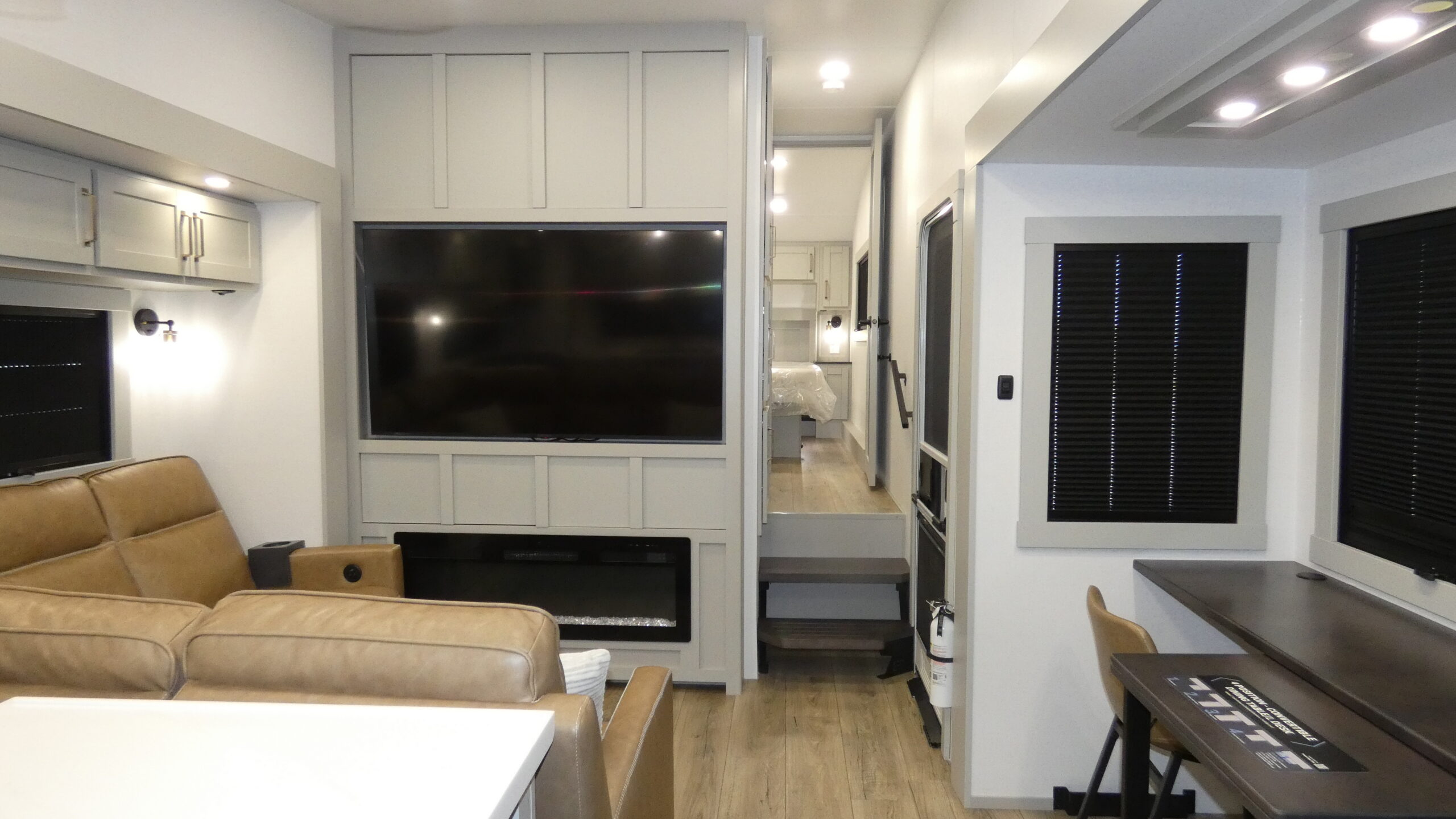 L-Sofa with Four Recliners Flip-Up Countertop Fireplace Dual Awnings Shoe Storage