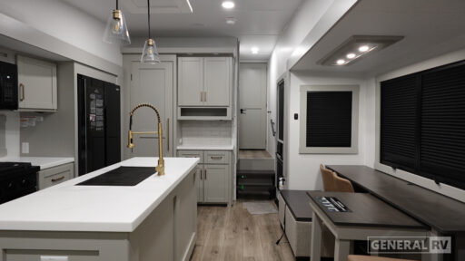 You're going to love every minute spent in this spacious fifth wheel that can sleep four. There is an inviting rear living area with a 72" tri-fold sofa and theater seating across from the televator and fireplace. The chef of your group can whip up dinner on the three burner cooktop or in the 30" residential microwave, and there is a 16 cu. ft. refrigerator that even opens when with the slide out is in. You will also enjoy the kitchen island with a farmhouse sink and roller cover, dual trash bins with a Stow N' Go paper towel holder, plus convenient dog bowls for your furry friends. You can store all your paper goods and snacks in the 84" pantry with adjustable shelving, and there is a hutch for nice dishes plus shoe storage in this model as well. Head to the front master bedroom where you'll find a queen bed with a TV, a large slide out with a wardrobe with drawers, plus a spacious bath.