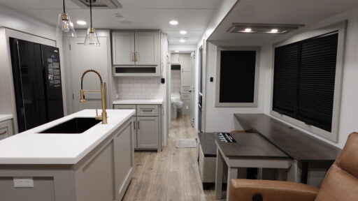 Kitchen Island Theater Seating One-Piece Fiberglass Shower Queen Bed Drop-Frame Pass-Thru Storage