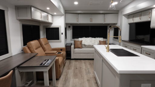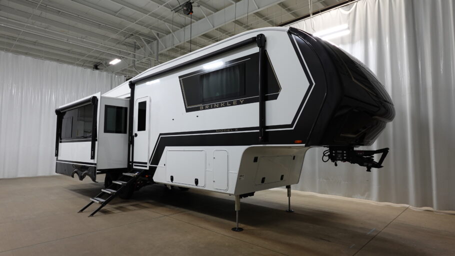 The Brinkley mid-profile Model Z fifth wheels bring you clean lines and an upscale look with plenty of style and exciting new features like the industry first brass plumbing connections. These units also feature an automotive grade front cap, plenty of exterior storage, dual exterior hot and cold showers, and wide stance leveling jacks for easy set up. Residential frameless windows provide a clean look and beautiful views, and ample electrical outlets and 6 USB/USB-C outlets allow all of your electronics and appliances to easily be used and charged.