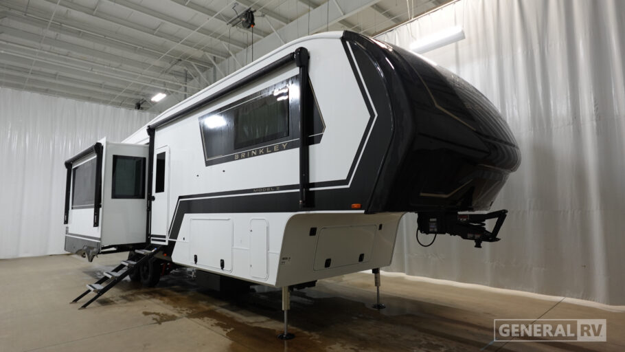 The Brinkley mid-profile Model Z fifth wheels bring you clean lines and an upscale look with plenty of style and exciting new features like the industry first brass plumbing connections. These units also feature an automotive grade front cap, plenty of exterior storage, exterior hot and cold showers, and wide stance leveling jacks for easy set up. Residential frameless windows provide a clean look and beautiful views, and ample electrical outlets and 6 USB/USB-C outlets allow all of your electronics and appliances to easily be used and charged.
