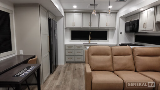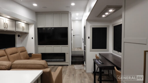 Escape to a world of comfort and luxury with this incredible fifth wheel! The living area features a plush L-sofa, five recliners, and a warm fireplace. The versatile dining table/L desk seats up to four people, making it perfect for meals, work, or play. Ample shoe storage and a convenient spot for pet bowls enhance comfort and practicality. The kitchen offers stunning solid surface countertops, dishwasher prep, a residential microwave, and a three-burner cooktop. The expansive pantry with pull-out drawers provides ample storage for your favorite ingredients and cooking essentials. The full bathroom is a serene oasis, featuring a linen closet for added storage and convenience. The front bedroom is a peaceful sanctuary, featuring a spacious king bed, shelves, and a sliding dresser top with hidden storage. The generous wardrobe and shoe rack provide ample storage for your clothes and shoes.