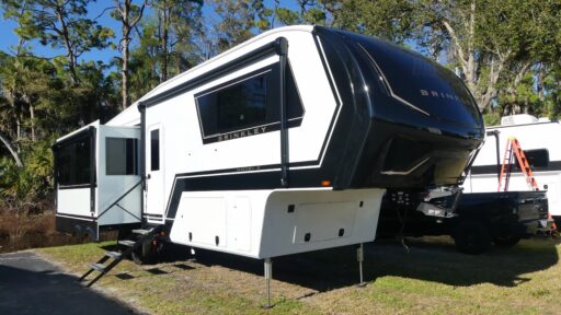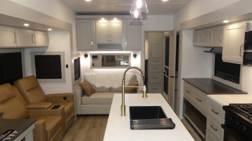 The Brinkley mid-profile Model Z fifth wheels bring you clean lines and an upscale look with plenty of style and exciting new features like the industry first brass plumbing connections. These units also feature an automotive grade front cap, plenty of exterior storage, dual exterior hot and cold showers, and wide stance leveling jacks for easy set up. Residential frameless windows provide a clean look and beautiful views, and ample electrical outlets and 6 USB/USB-C outlets allow all of your electronics and appliances to easily be used and charged.
