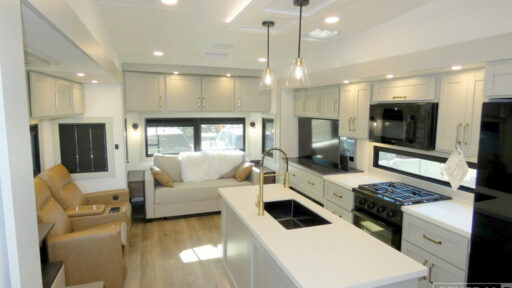 The Brinkley mid-profile Model Z fifth wheels bring you clean lines and an upscale look with plenty of style and exciting new features like the industry first brass plumbing connections. These units also feature an automotive grade front cap, plenty of exterior storage, dual exterior hot and cold showers, and wide stance leveling jacks for easy set up. Residential frameless windows provide a clean look and beautiful views, and ample electrical outlets and 6 USB/USB-C outlets allow all of your electronics and appliances to easily be used and charged.