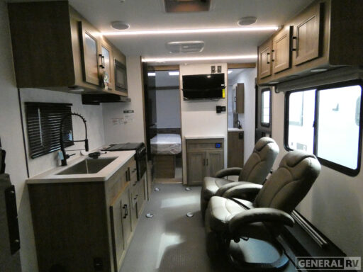 Relax in the front bedroom, which hosts a cozy queen bed, promising restful nights. The 21LT accommodates up to six sleepers, making it perfect for family trips or outings with friends. The thoughtful design includes a center bath with a plastic/glass shower, ensuring convenience and privacy. Enjoy the outdoors under the 19-foot powered retractable awning, providing shade and comfort as you unwind. With a dry weight of 6,098 pounds, this RV is ready to handle all your travel needs. For more details, visit your nearest General RV dealership and start planning your next great adventure.