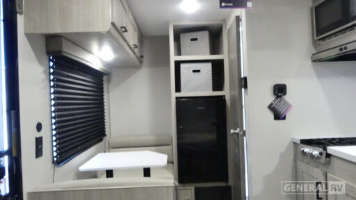 Lightweight camping is easier than you think with this travel trailer in tow! The front 54" x 74" bed will provide a great night's rest each night, while your overnight guest takes the booth dinette. There is a handy shelf above the front bed for your belongings plus additional bedroom storage. A private bath includes a 24" x 32" shower and a toilet with a mirror behind it so you can freshen up each day. You'll also find a two burner cooktop and microwave oven to make meals each day plus a 3.3 cu. ft. 12V refrigerator for food storage!