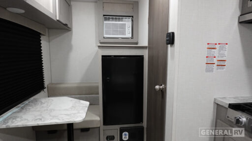 Lightweight camping with at-home comforts is possible with this travel trailer in tow! Once you arrive at the campground, you can unload the exterior storage, put out the awning, then head inside to make lunch on the two-burner cooktop. There is a refrigerator to keep your items fresh, plus a sink with a cup rinse for added convenience. The booth dinette provides a place to dine together, play a board game in the evenings, and let a guest or two little ones sleep on. You'll have the front 54" x 74" RV queen bed to yourselves, along with an overhead shelf and bedroom storage for your things. And don't overlook the private bath with a toilet and 24" x 32" shower!