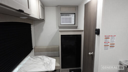 Lightweight camping with at-home comforts is possible with this travel trailer in tow! Once you arrive at the campground, you can unload the exterior storage, put out the awning, then head inside to make lunch on the two-burner cooktop. There is a refrigerator to keep your items fresh, plus a sink with a cup rinse for added convenience. The booth dinette provides a place to dine together, play a board game in the evenings, and let a guest or two little ones sleep on. You'll have the front 54" x 74" RV queen bed to yourselves, along with an overhead shelf and bedroom storage for your things. And don't overlook the private bath with a toilet and 24" x 32" shower!